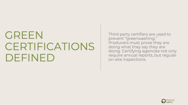 Third party certifiers are used to prevent “greenwashing.” Producers must prove they are doing what they say they are doing. Certifying agencies not only require annual reports, but regular on-site inspections.