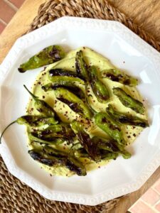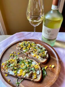 I’ve prepared a few of my favorite summertime nibbles. If you haven’t discovered shishito peppers yet, I have a simple recipe you will want to make again and again this summer. Who doesn’t love shrimp? Fast and easy sautéed or grilled shrimp with Chermoula, a Moroccan herb sauce that I have been putting on everything, speaking of packing a punch of flavor! Another summertime go-to is toasts topped with farmer’s market finds like oyster mushrooms, fennel lavender goat cheese, sweet corn, and basil. My summertime wine to pair with these nibbles is Prosecco for its lightweight and refreshing tiny bubbles.